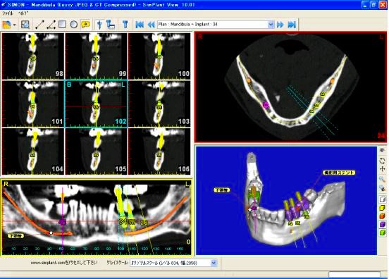 当医院では、最先端のコンピューターシステムを活用してインプラント治療を実施しています。インプラント治療を適切に行うためには、顎の骨の状態を詳しく調べることが重要です。そこで治療前に当院で必ずCT撮影を行いこのデーターをもとに最先端のコンピューターシステムを使用して顎の骨の状態を見ながら治療計画を立てます。